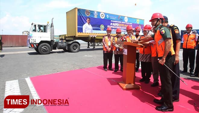 TIMES Garut/Gubernur Jawa Timur. Dra. Hj. Khofifah Indar Parawansa saat melepas ekspor komoditi pertanian di Terminal PetikEmas Surabaya (TPS). Kamis (21/3/2019). (FOTO: TIM Media For TIMES Indonesia)