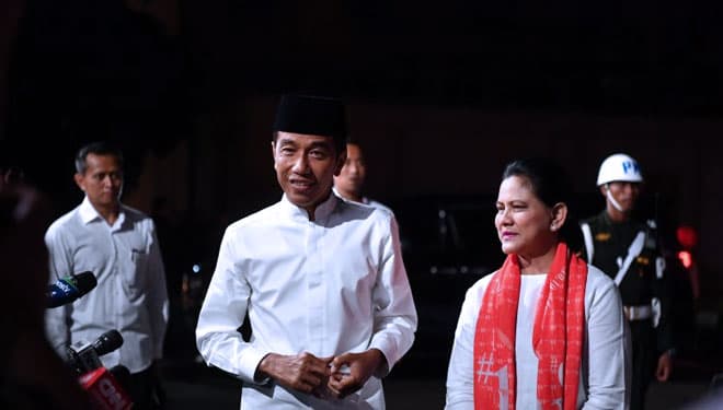 TIMES Garut/Capres nomor urut 01 Joko Widodo bersama istri Iriana Joko Widodo tiba di lokasi untuk mengikuti debat Pilpres 2019 putaran kelima, di Hotel Sultan, Jakarta, Sabtu (13/4/2019). (FOTO: Rivan Awal Lingga/Antarafoto)