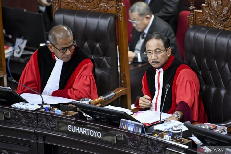 TIMES Garut/Ketua Mahkamah Konstitusi (MK) Suhartoyo (kanan) bersama Wakil Ketua MK Saldi Isra memimpin sidang pengucapan putusan perkara dilanjutkan atau tidak (dismissal) sengketa Pilkada 2024 di Gedung Mahkamah Konstitusi, Jakarta, Rabu (5/2/2025). (ANTARA)