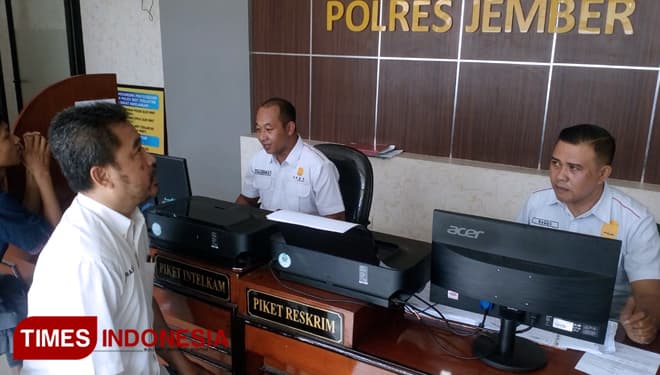 TIMES Garut/Wakil Ketua Bidang Litbang dan IT DPD Partai Perindo Kebupaten Jember, Ahmad One Prastiono saat melaporkan Ketua DPD Partai Perindo Kabupaten Jember Hanung Prijobodo ke Polres Jember, Senin (6/5/2019). (FOTO: Dody Bayu/TIMES Indonesia)